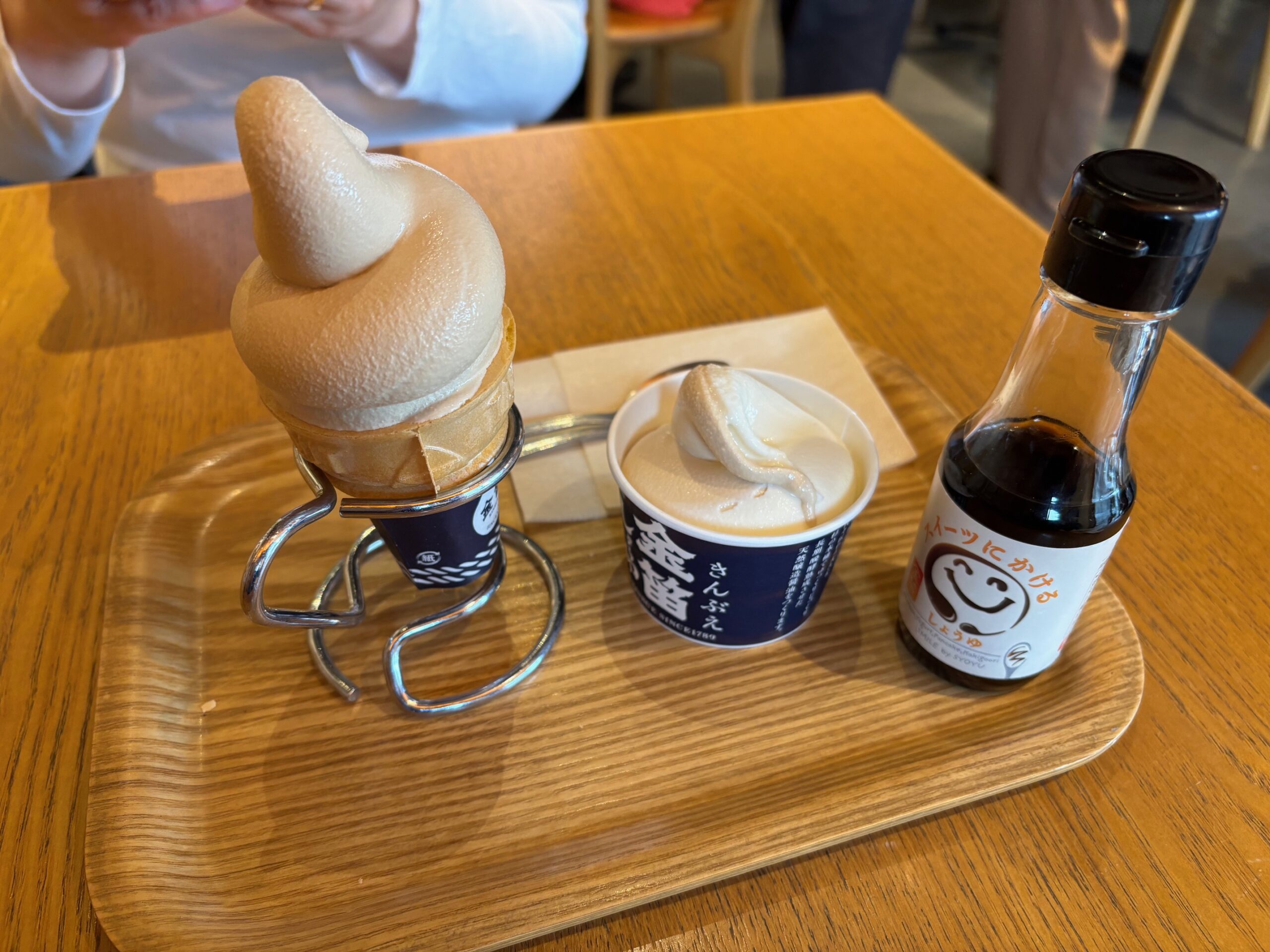 外で食べることもできますがレストランでソフトクリームをいただくとお好みでスイーツ用の醤油をかけられます。